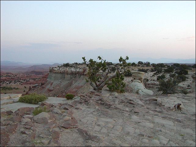 The sun's gone below the western horizon, so we decide to spend the night here. Before long, we'll be surrounded by truckers and other's who need a spot for the night.We're up early next morning and on our way again. Today we'll meet our friends Floyd and Diane near Gunnison, Colorado.Not far down the road we see this figure that stands out on the landscape. It's called "Ghost Rock." This is the top of the San Rafael Swell anticline, the remains of a dome after millions of years of erosion. Bordered by huge blocks of the Navajo Sandstone formation, this area is called the Head of Sinbad. The stone "ghosts" show the power of wind and water. Imagine riding your horse through the San Rafael Swell in a heavy fog. Standing above the fog are two huge white rocks. Would you think you had seen a ghost? A cowboy thought so, hence its name.Cowboys in the Swell were a daring, tough lot and the Swasey brothers (Charlie, Sid, Joe and Rod were tougher than most. They herded cows and rounded up wild horses here.Their cabin still stands, nestled in the white sandstone cliffs below, an area called the Head of Sinbad. Here they built horse traps made from twisted juniper.It was here that Joe had his office in an alcove in the white sandstone. Farther east, Charlie bet Sid his herd of cattle that Sid couldn't jump his horse across the deep San Rafael River gorge. It was about a sixteen foot jump. He made the jump, won the cattle and became a legend in San Rafael Country.