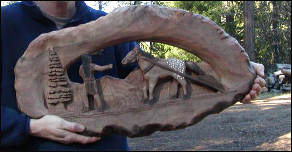 Randy stopped by today (9/29/07) with this carving of a birch-tree thicket. His carvings can be seen on the walls in many businesses. Next time you're in Jimboy's Taco or the 76 gas station at Brunswick (Grass Valley), Northridge restaurant's in Nevada City and Penn Valley, and Mountain Hardware in Truckee you might just see a carving by Randy.