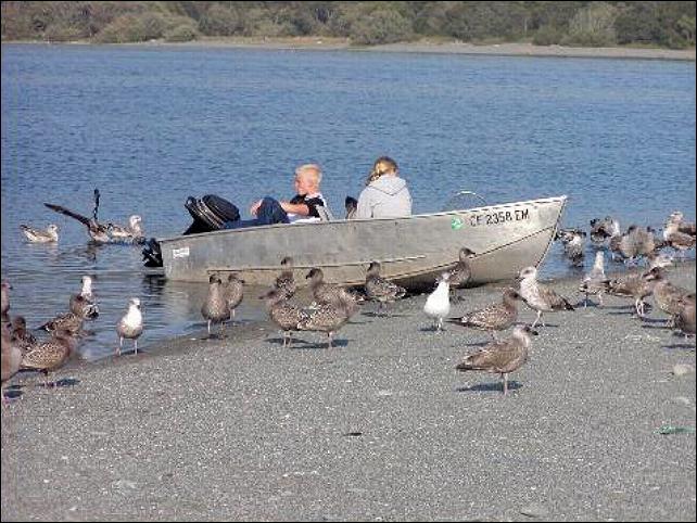 Seven little seagulls all in a row... greedily wait for dinner.