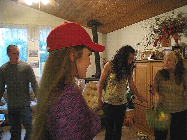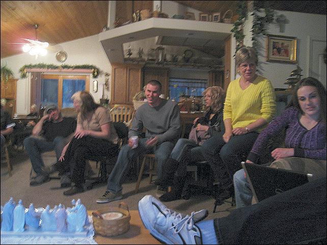The neighbor's cold and shivering lil' Punky dog showed up and is comforted by Papa, while Tim relaxes on the sofa. Don't remember who won the last game, but then eleven of us shifted gears to play Egyptian Rap Slap. It gets pretty wild whenever someone lays down a card that matches the top one on the pile in the middle of the table. Fastest hand on the cards gets them. As players out of cards are eliminated...whoever winds up with all the cards wins. We had to use two decks, because so many were playing. Those left playing are wondering if it will ever end. (Hahaha...That' what you get for being so fast.)