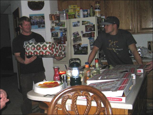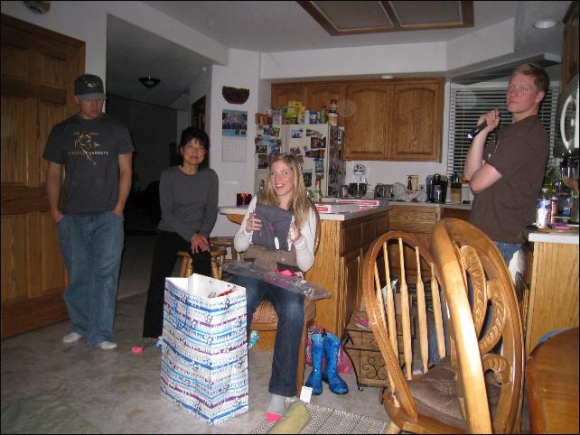 Time for Vicky to open her gifts. Brent's holding the flashlight for us to see better. The flash from my camera really lights things up.