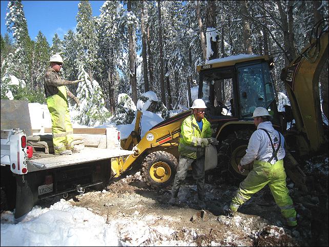 The cedar fell and stabbed into the steel culvert. Saturday morning NID brought in some big equipment to plow the road to the area (below our shop) to repair it. Bob, Andrew, Matt, Todd, Brian, Rod and others were busy getting everything finished. Good job guys.