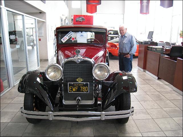 Easter afternoon the turbo on our RV blew a hole in the hose. Evidently, Mel clamped the other hose well, so it couldn't blow off again. The turbo pressure found another weak place. He mad an appointment to take it to the Dodge Dealer in Folsom that works on them. The guy who does it said they use better hoses now, and when he's finished with the Super-Glue they don't come off. While we waited we admired the antique Dodge in their showroom. Naturally each of us got a mug shot with it. I'd mention what year it was if I could remember. Maybe you know?